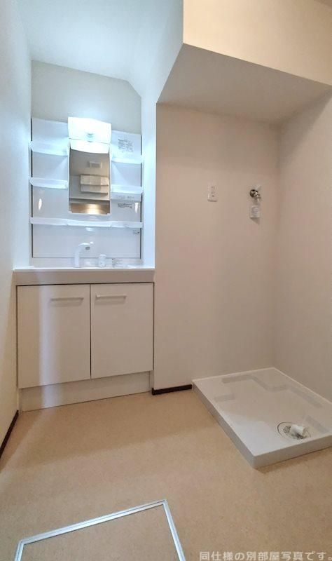 身支度に必要となる様々なアイテムを収納可能なスペースがある独立洗面台を設置しています。知らない人が来た時でも玄関を開ける必要がなくなるモニター付きインターホンがあります。新築の物件です。