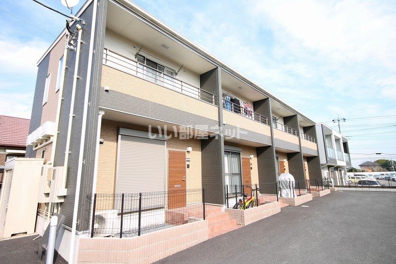 フルールは、茨城県坂東市辺田にある2階建の賃貸テラスハウスです。関東鉄道常総線 水海道駅からバスにて20分 辺田三叉路下車 徒歩1分の距離にあります。2017年10月に完工し、建物の構造は木造です。