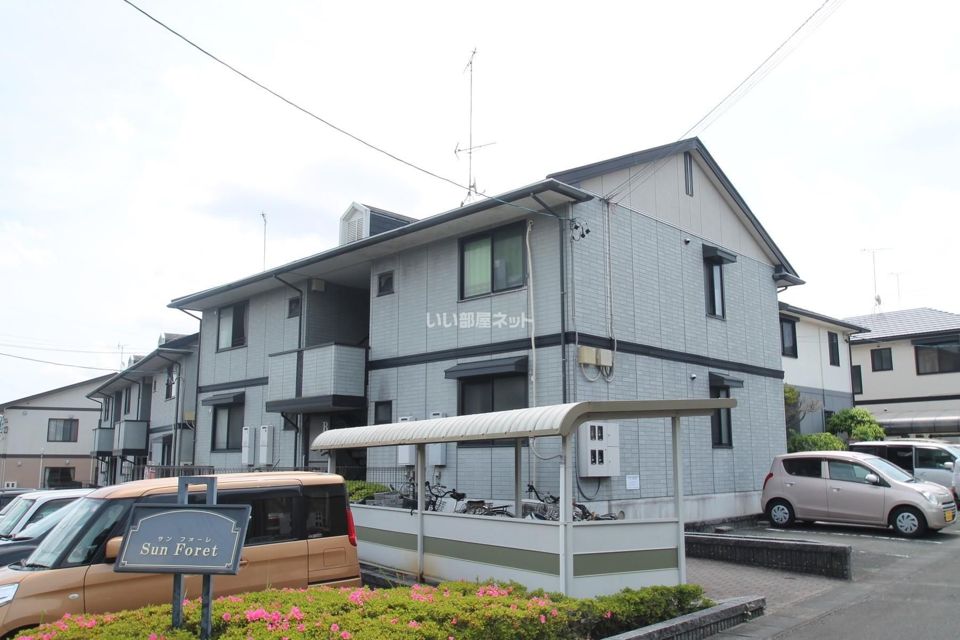SUN FORET Bは、静岡県掛川市家代の里2丁目にある2階建の賃貸アパートです。天竜浜名湖鉄道 いこいの広場駅 徒歩18分の距離にあります。1999年10月に完工し、建物の構造は軽量鉄骨です。